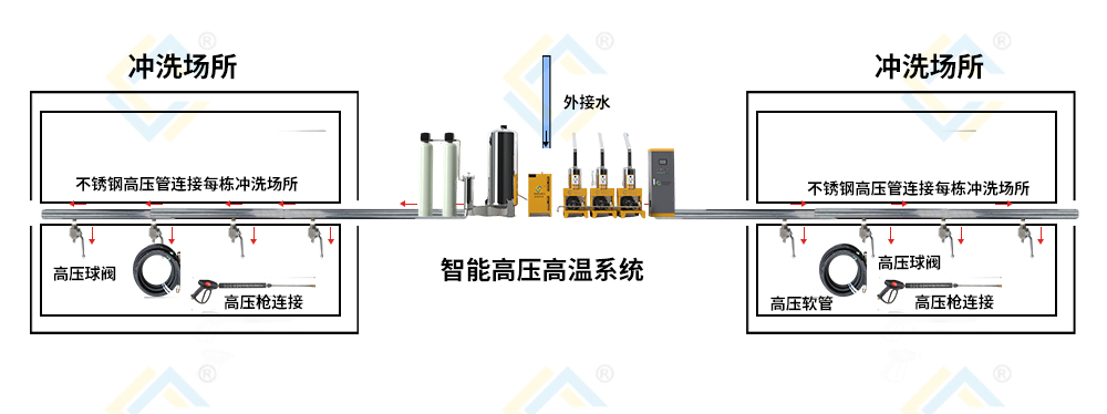 通過場所平面圖,選中合適位置布局智能高壓高溫主機,外接水通過主機,向各個場所供應(yīng)高壓高溫水,并且可以實現(xiàn)物聯(lián)網(wǎng)控制主機啟動,員工只需攜帶高壓軟管和高壓水槍就可以作業(yè),各個場所可以同時作業(yè),提高工作效率,無觸電風(fēng)險!